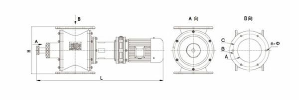 | 型号 | A | B | C | H | L | n-φ | 工作温度 ℃ | 转速r/min | 电机功率 kw |